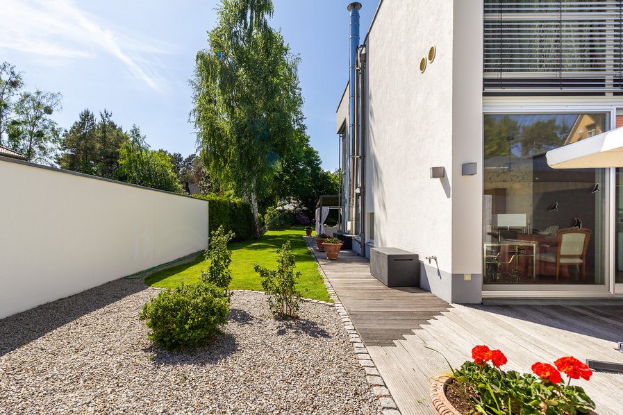 Die Immobilie vereint zeitlose Eleganz mit durchdachter Funktionalität und bietet ein Zuhause für höchste Ansprüche. Der traumhaft angelegte Südwestgarten mit seinen perfekt inszenierten Außenbereichen lädt zum Entspannen und Genießen ein, während hochwertige Materialien und exklusive Ausstattungsdetails im Inneren ein Wohnambiente auf erstklassigem Niveau garantieren.