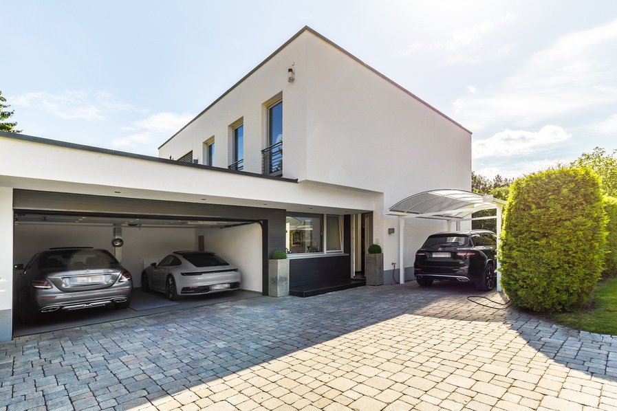 Doppelgarage mit elektrisch betriebenem Sektionaltor sowie zusätzlicher Carport