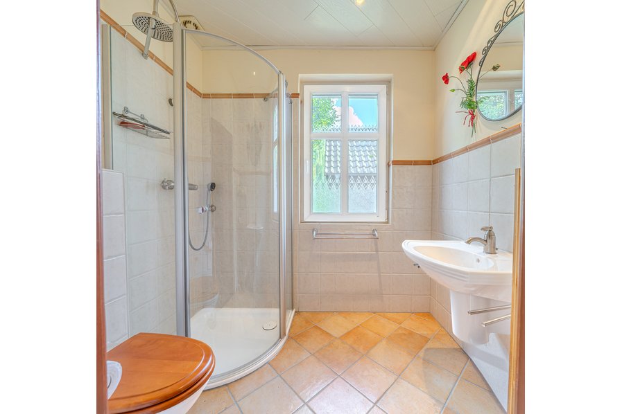 Im Erdgeschoss erwarten Sie zwei gut geschnittene Zimmer, eine Küche, ein Badezimmer, ein Flur sowie ein praktischer Windfang. Vom Flur führt eine schöne Holztreppe hinauf ins Dachgeschoss.
