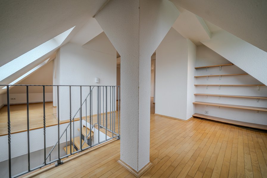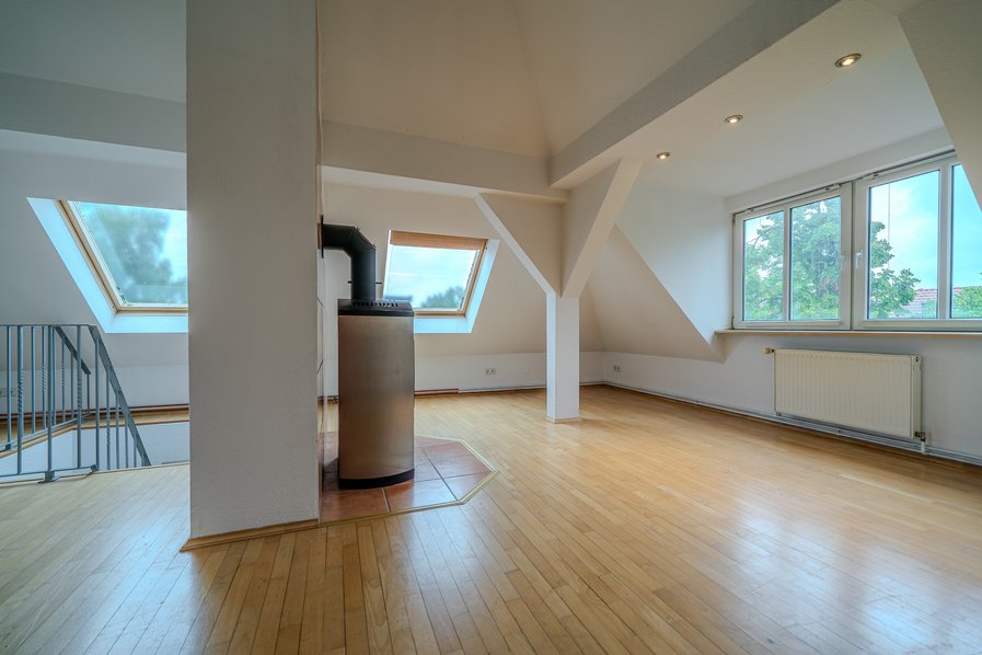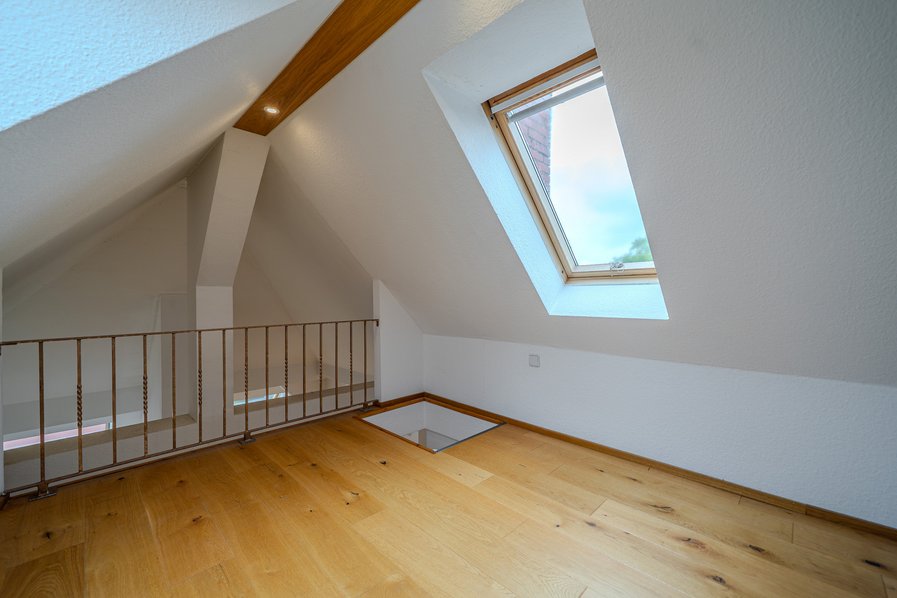 In der Wohnung erwarten Sie ein einladender Flur, ein helles Tageslicht-Badezimmer, ein weiteres Zimmer sowie eine großzügige Wohnküche mit viel Platz für Kochen und Geselligkeit. Von hier aus führt eine Treppe ins Dachgeschoss.