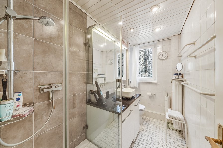 modernisiertes Tageslichtbad mit Fenster und Duschkabine