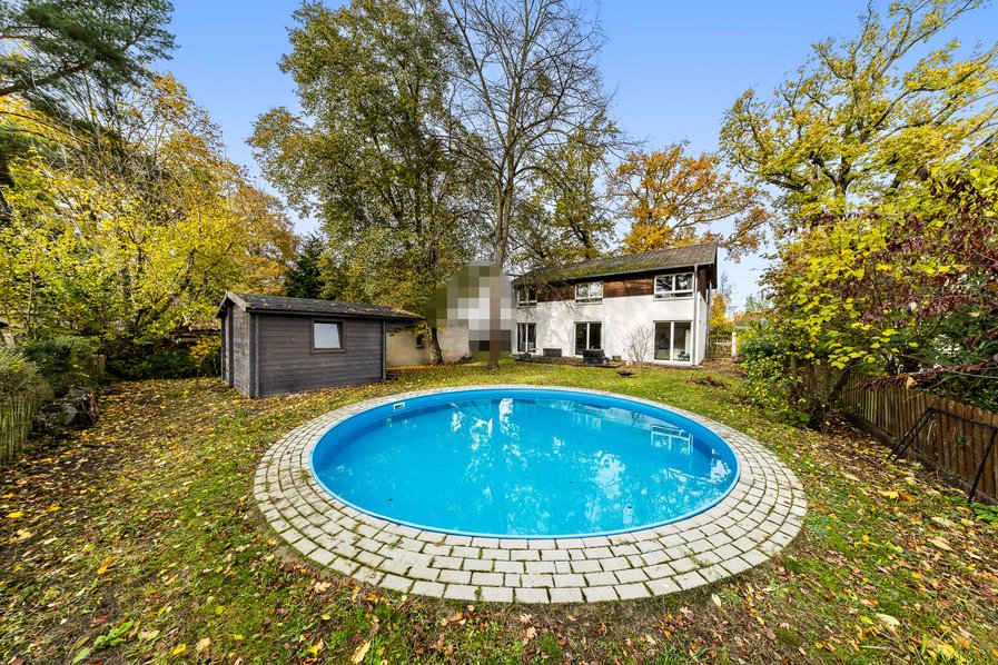 Auf dem sonnigen Gartengrundstück befinden sich außerdem eine Garage, ein Gerätehäuschen sowie der Pool.