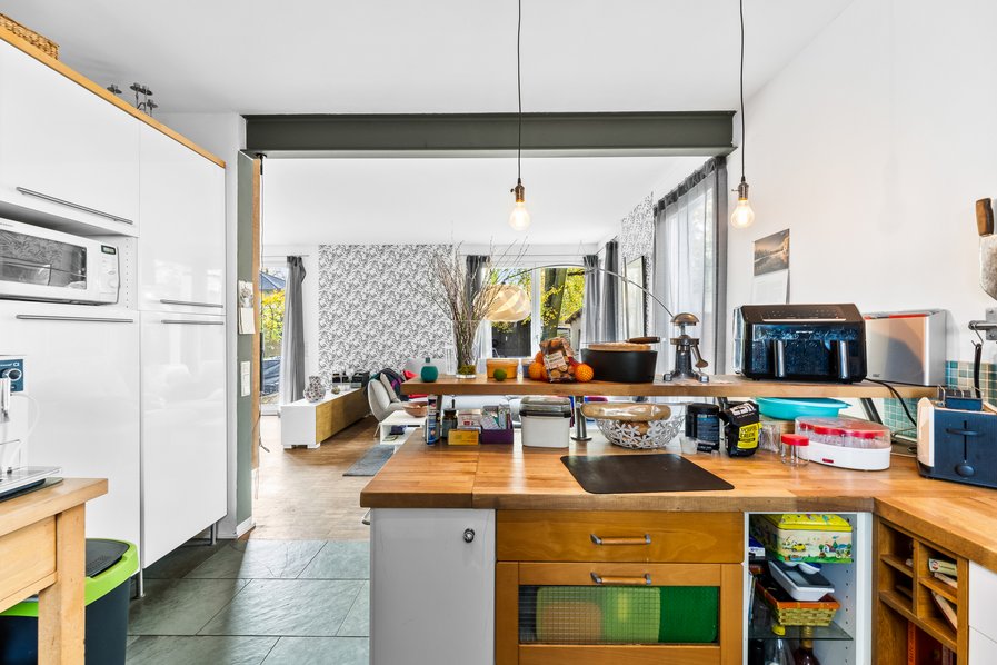 Ein großzügiger Wohn- und Essbereich mit offener Küche und Zugang zur sonnigen Südwestterrasse bildet das Herzstück des Hauses. Hinzu kommen ein weiteres Zimmer, ein Windfang mit Garderobe, ein Gäste-WC, ein Flur sowie ein Hauswirtschaftsraum. Vom Flur führt eine schöne Holztreppe ins Obergeschoss.