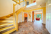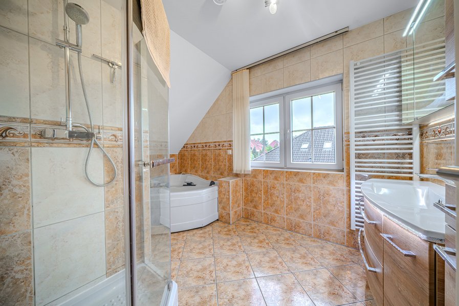 Im Erdgeschoss befinden sich ein großzügiges Wohn-/Esszimmer mit Kamin, Glaserker und Zugang zur Terrasse, eine geräumige Küche mit Essbereich und einem weiteren Zugang zur Terrasse, ein Gäste-WC mit Dusche, ein Hauswirtschaftsraum, eine Diele und Garderobe und ein weiteres Zimmer. Von der großzügigen Diele führt eine hochwertige Buchentreppe in das Dachgeschoss.
